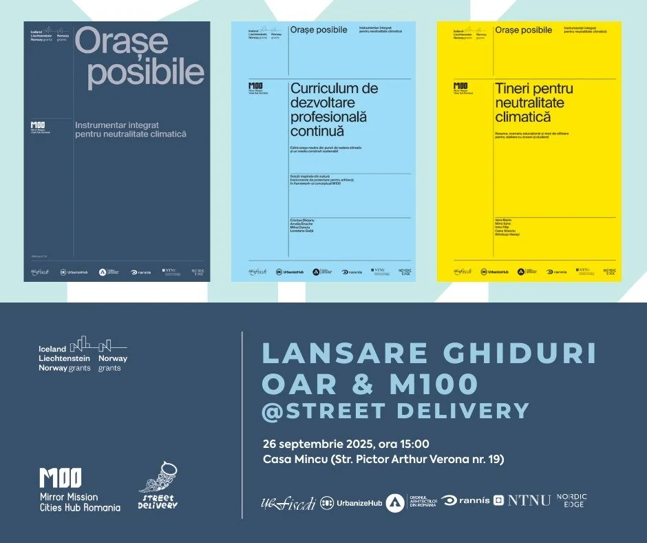 Orașe Posibile. Lansarea ghidurilor M100 și masa rotundă despre neutralitatea climatică. Evenimentul de lansare a ghidurilor dezvoltate în cadrul inițiativei M100, urmat de o masă rotundă despre neutralitatea climatică în orașe va avea loc vineri, 26 septembrie 2025, începând cu ora 15:00, la Casa Mincu, București.